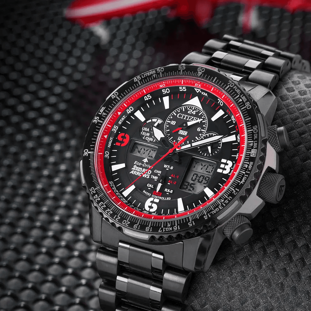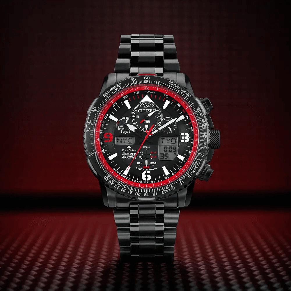 Engineered for precision, the Citizen Red Arrows is a professional-grade timepiece inspired by the legendary Royal Air Force aerobatic team. Crafted from 46mm stainless steel, the case delivers a commanding presence on the wrist. The black dial is enriched with multi-functional digital displays, offering instant access to key data at a glance. Protected by Anti-Reflective sapphire crystal, it ensures superior clarity and scratch resistance.