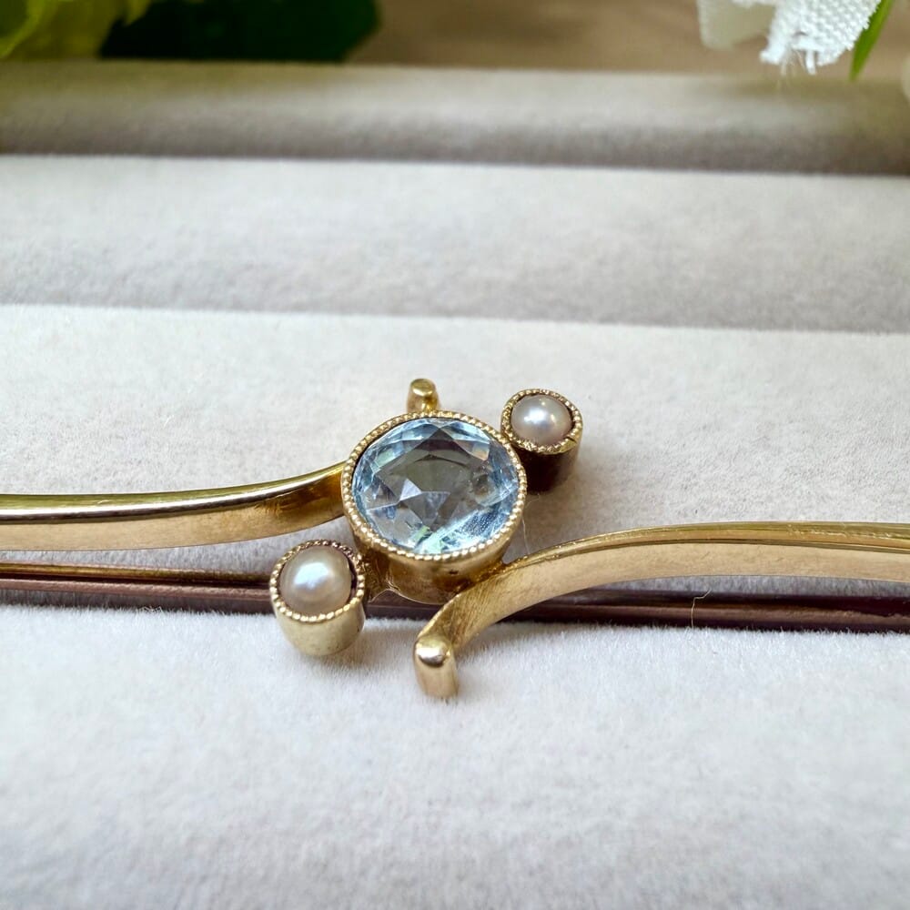 Second Hand 9ct Yellow Gold Aquamarine & Pearl Brooch
